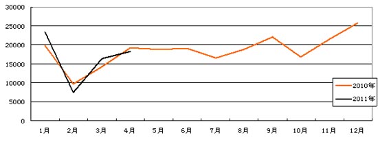 2011年,客車市場形勢并不樂觀,根據(jù)中國客車統(tǒng)計信息網(wǎng)發(fā)布的數(shù)據(jù),1-4月,累計銷售客車65200輛,同比僅僅增長3.70%;4月份,客車銷量18189輛,同比卻下降了5.44%,市場傳遞出令人擔(dān)憂的信號。月度銷量曲線如圖所示,前4個月,兩條曲線緊密纏繞,與去年相比,今年的客車市場要想取得突破難度較大。