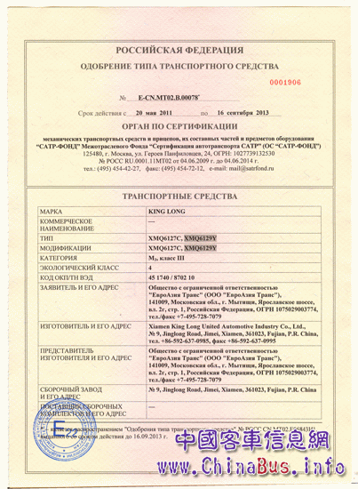 繼2010年9月16日,大金龍XMQ6127C車型獲得俄羅斯GOST認(rèn)證證書之后,經(jīng)過半年的精心準(zhǔn)備,今年5月20日,大金龍“龍威”XMQ6129Y也順利通過俄羅斯GOST認(rèn)證,獲準(zhǔn)進(jìn)入當(dāng)?shù)厥袌。?jù)了解,XMQ6129Y獲得的GOST認(rèn)證證書是俄羅斯客車認(rèn)證中要求最嚴(yán)格的認(rèn)證,有效期為期3年,這也標(biāo)志著 XMQ6129Y的產(chǎn)品質(zhì)量得到了俄羅斯認(rèn)證機構(gòu)的認(rèn)可。