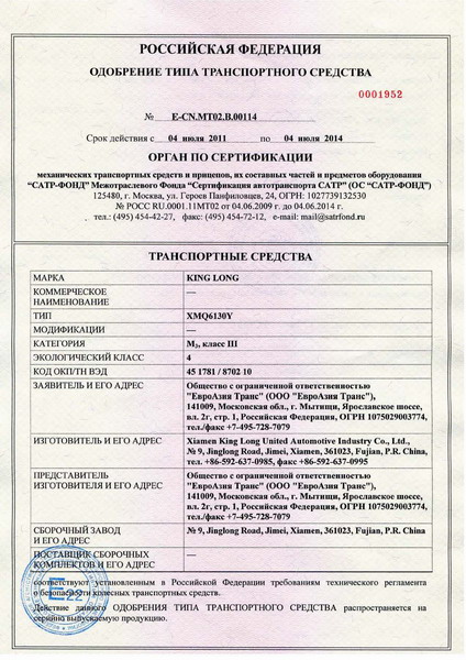大金龍三軸客車XMQ6130Y正式獲得俄羅斯GOST認證證書