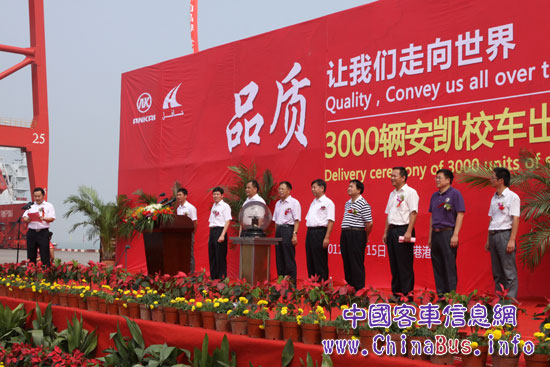2011年8月15日上午,“品質(zhì)•讓我們走向世界”——3000輛安凱校車出口沙特發(fā)車儀式在美麗的濱海城市江蘇省連云港港口隆重舉行。來自安徽省商務(wù)廳、安徽安凱汽車股份有限公司、連云港港口集團(tuán)公司的相關(guān)領(lǐng)導(dǎo),以及包括新華社、中央電視臺、中國汽車報(bào)、中國工業(yè)報(bào)、安徽日報(bào)等在內(nèi)的全國50多家知名媒體一起,共同見證了中國客車出口的歷史性時(shí)刻。