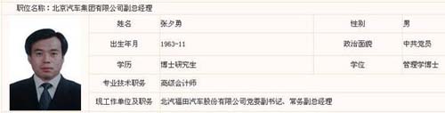 根據(jù)公開資料,張夕勇自1980年參加工作以來,一直在北汽福田工作,先后擔(dān)任技術(shù)員、財(cái)務(wù)科長(zhǎng)、團(tuán)委書記、副廠長(zhǎng)等職務(wù),并曾擔(dān)任北京汽摩山東分公司副經(jīng)理等職。