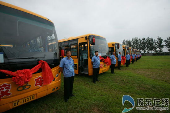 8月27日上午,招遠(yuǎn)市首批33輛學(xué)生專用新型校車在張星鎮(zhèn)初中門口亮相,這是今年招遠(yuǎn)市委、市政府確定的重點為民服務(wù)實事項目。這款校車車身底色為桔黃色,車身用紅色字體標(biāo)注出“校車”專用字樣,每車核定載學(xué)生45座,座椅的大小、間距等均是為青少年量身打造,每個座位都安裝了安全帶,且配備了GPS、汽車行駛記錄儀,對車輛的行駛速度等有警示作用,同時校車的駕駛員們也進行了特殊的培訓(xùn),從思想課到技能培訓(xùn),這些均有8年駕齡的老司機都上足了發(fā)條。