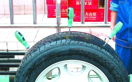 不怕扎也不怕漏氣。即使是被長達10厘米的10顆鐵釘扎穿。因為在輪胎內(nèi)壁附有的特殊材料,有極強的粘性和回彈性。當(dāng)尖銳物扎入時,防漏密補層會緊緊包裹住尖銳物,從而防漏;當(dāng)尖銳物拔出時,防漏密補層破口處會自動收口,依靠粘性使破口處防漏密補層粘合。