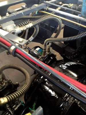 底盤(pán)上的制動(dòng)軟管也被分成了黑色(用于普通地區(qū),國(guó)標(biāo)-40℃)和紅色(用于高寒地區(qū)-60℃)兩種。這是由于這兩種軟管的接口和尺寸完全一樣,如果裝錯(cuò),在高寒地區(qū)普通的軟管就會(huì)發(fā)生斷裂,造成制動(dòng)失靈。因此鮮明的顏色可以避免工人在裝配中出錯(cuò),減少安全隱患。