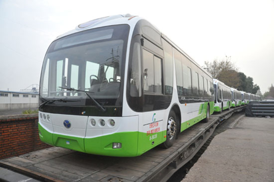 昨日,24輛整裝待發(fā)的揚子江新型雙源無軌電車,在舵落口火車站列隊緩緩駛上火車,發(fā)往太原。