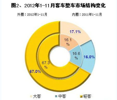 宇通客車在大客和中客市場均占據(jù)主導地位,今年1-11月銷量均在兩萬輛以上——分別為2.01萬輛和2.04萬輛,其他企業(yè)在這兩個市場銷量卻均不足萬輛。而在輕客市場其銷量雖相對較低,僅有3658輛,但比去年同期增長了三分之一。