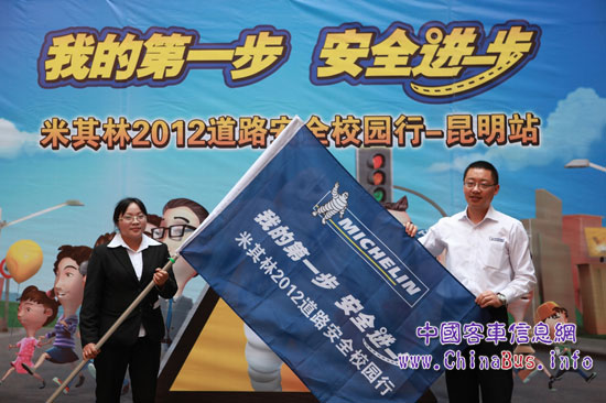 米其林(中國)投資有限公司品牌與傳播部總監(jiān)張震向昆明紅星小學(xué)康紹永女士授予“我的第一步,安全進(jìn)一步”道路安全校園行的旗幟