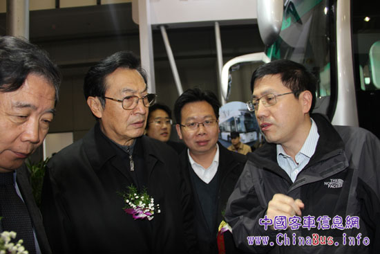 中國城市公共交通協(xié)會科學(xué)技術(shù)分會理事長李世豪和北京公交集團(tuán)副總經(jīng)理馮幸福為福田歐輝新車揭幕