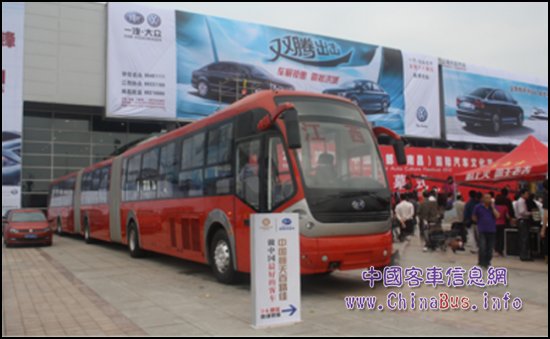 中國恒天•百路佳客車精彩亮相。27米雙鉸“世界上最長”的大客車(BRT)展示于主席臺旁,引來眾多關注的目光,各路媒體爭相報道。