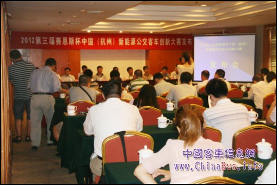 2012年8月8日,第三屆賽恩斯杯中國(guó)(杭州)節(jié)能與新能源公交客車創(chuàng)新大賽發(fā)布會(huì)在北京大方飯店舉行。中國(guó)城市公共交通協(xié)會(huì)科學(xué)技術(shù)分會(huì)秘書長(zhǎng)葉東強(qiáng)、中國(guó)城市公共交通協(xié)會(huì)科學(xué)技術(shù)分會(huì)理事長(zhǎng)李世豪以及北京公交集團(tuán)有限公司副總經(jīng)理馮幸福、杭州公交集團(tuán)有限公司技術(shù)部部長(zhǎng)高新華、天津公交集團(tuán)物資有限公司董事長(zhǎng)許重光、寧波市公交總公司副總經(jīng)理許賡等領(lǐng)導(dǎo)出席會(huì)議。