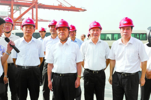圖為楊傳堂一行在武漢陽邏集裝箱碼頭檢查安全生產(chǎn)。