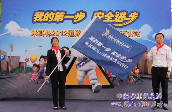米其林(中國)投資有限公司副總裁于航先生向西安未央?yún)^(qū)馬家寨小學李菊蓮校長授予“米其林2012道路安全校園行”旗幟