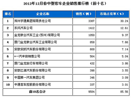 2012年12月中型客車企業(yè)銷售排行前十(圖)