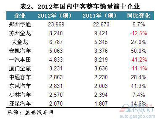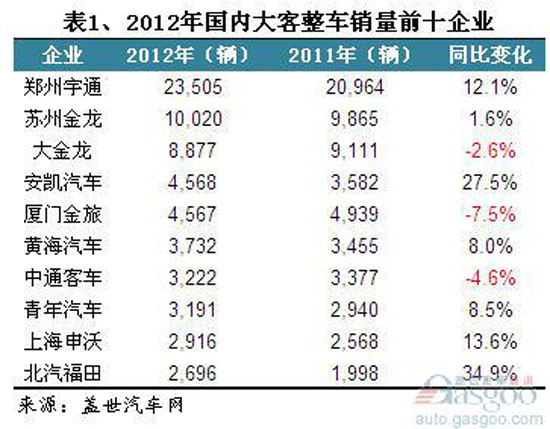 2012年大客市場(chǎng)銷量前十企業(yè)依次是鄭州宇通客車、蘇州金龍、大金龍、安凱汽車、廈門金旅、黃海汽車、中通客車、青年汽車、上海申沃和北汽福田。與2011年相比,安凱汽車超過(guò)廈門金旅,排名由第五升至第四位。