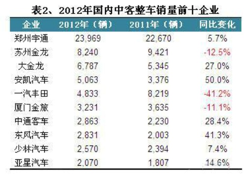 與2011年相比,這些企業(yè)中,安凱汽車(chē)銷(xiāo)量增長(zhǎng)最快——中客銷(xiāo)量增長(zhǎng)50%至5063輛。其次是東風(fēng)汽車(chē),銷(xiāo)量增長(zhǎng)41.3%至2831輛。而一汽豐田銷(xiāo)量降幅最高——中客銷(xiāo)量下滑逾四成(為41.2%)至4833輛。蘇州金龍和廈門(mén)金旅銷(xiāo)量分別下滑12.5%和11.1%。
