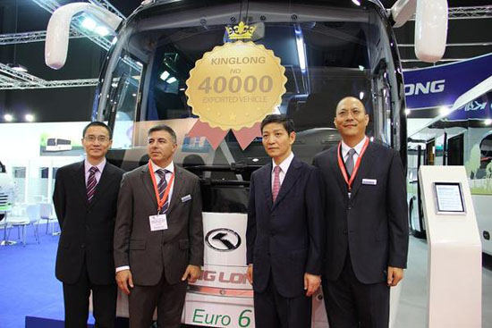 廖大使和Luc Glorieux等嘉賓為宇通兩款12米和9米的新車揭幕,宇通公司負(fù)責(zé)人介紹了企業(yè)概況以及參展車型的性能和特點(diǎn)。廖大使隨后在組委會(huì)陪同人員引導(dǎo)下看望其他中國(guó)參展商。比亞迪推出了全新的純電動(dòng)客車ebus,完全實(shí)現(xiàn)零排放。安徽安凱不僅展出了最新型號(hào)客車,還展示了用于2012年倫敦奧運(yùn)會(huì)期間的雙層旅游觀光巴士。廈門金龍公司展出了采用歐6標(biāo)準(zhǔn)的第40000輛出口客車,顯示了強(qiáng)勁的國(guó)際競(jìng)爭(zhēng)能力。