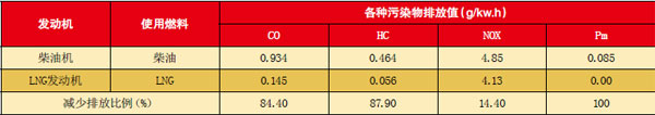 環(huán)保性好—經(jīng)實驗檢測,LNG發(fā)動機與同相同功率柴油機的各排放物對比數(shù)據(jù)見表二。同類型的LNG發(fā)動機比柴油機的噪音降低了7dB,提高了司乘人員的舒適性。