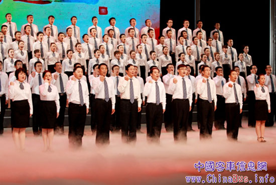 宇通集團(tuán)黨委書(shū)記、總裁湯玉祥(左五)帶領(lǐng)中高層管理干部合唱《宇通之歌》