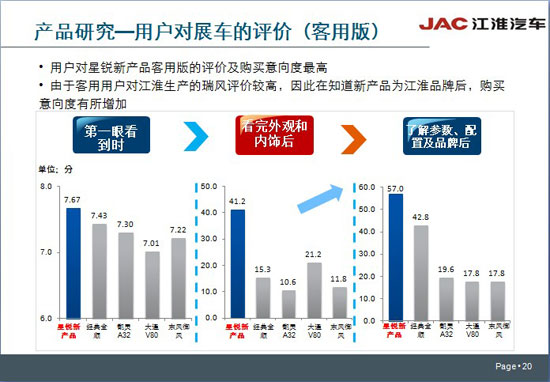 這一報告最讓人關注的是,在市場上現(xiàn)有的主要歐系輕客短軸產(chǎn)品中,江淮星銳4系的用戶購買意向度最高。測試報告以市場現(xiàn)有的5大歐系輕客品牌為研究對象,其中包括兩大合資品牌。購買意向度的測試分“第一眼看到時”、“看完外觀和內飾后”及“了解參數(shù)、配置和品牌后”三個環(huán)節(jié)進行,然后再評選出最后測試結果。在三個測試環(huán)節(jié)中,4系成績一路領先。最終在購買意向度的測試中,4系名列首位。