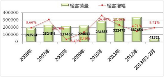 2013年開年輕客市場(chǎng)優(yōu)勢(shì)明顯,預(yù)計(jì)2013年輕客市場(chǎng)將保持增長(zhǎng),全年達(dá)到36萬輛左右。