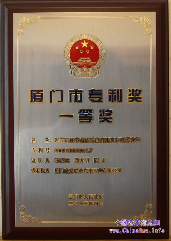 4月18日下午,在廈門市知識(shí)產(chǎn)權(quán)工作會(huì)議上,首屆廈門市專利獎(jiǎng)評(píng)選結(jié)果正式公布,廈門市專利獎(jiǎng)勵(lì)委員會(huì)通過專家初評(píng)、終評(píng)和結(jié)果公示,最終評(píng)選出2012年廈門市專利獎(jiǎng)一等獎(jiǎng)項(xiàng)目3項(xiàng)、二等獎(jiǎng)項(xiàng)目8項(xiàng)、三等獎(jiǎng)項(xiàng)目29項(xiàng)。其中,大金龍申報(bào)的發(fā)明專利《汽車總線節(jié)點(diǎn)的功能自定義和映射方法》被評(píng)為一等獎(jiǎng)的第一名,獲得10萬(wàn)元獎(jiǎng)勵(lì)。