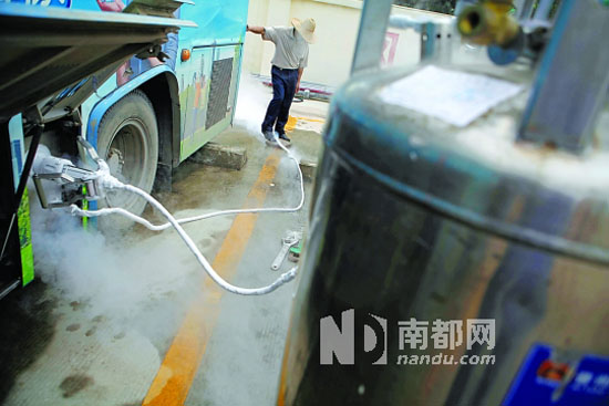 周一起惠州市公汽總公司先調(diào)配其中10臺(tái)公交車(chē)停駛,將LNG氣瓶排空,并按檢測(cè)要求,在瓶?jī)?nèi)充入零下190℃的液化氮,靜置24小時(shí)后,由廣東省特種設(shè)備檢測(cè)院的專(zhuān)家開(kāi)始正式檢測(cè)。