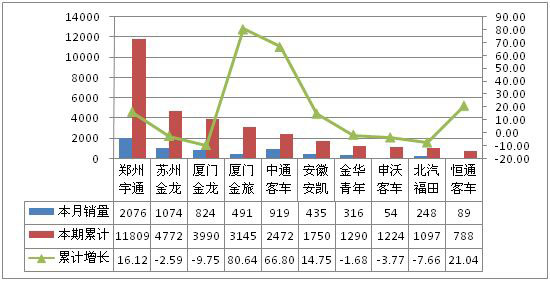 累計銷售前5名依次為鄭州宇通、蘇州金龍、廈門金龍、一汽豐田、和安徽安凱,累計銷量分別為11125輛、3710輛、3070輛、2600輛和2129輛。