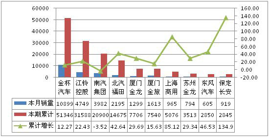 累計銷售前5名依次為金杯汽車、江鈴控股、南汽集團(tuán)、北汽福田和廈門金龍,累計銷量分別為51346輛、31588輛、20900輛、14675輛和7706輛。