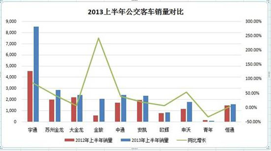 從統(tǒng)計(jì)圖表中可以看出,對公交車增長貢獻(xiàn)最大的莫過于第一軍團(tuán)!耙煌ㄈ垺彼募移髽I(yè)上半年公交的客車銷量,均明顯增長迅速。