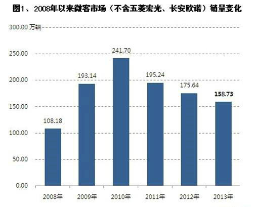 經(jīng)歷兩年的微增長后,國內(nèi)車市在2013年重新回歸兩位數(shù)快速增長軌道。然而,其中的微客市場銷量不僅未實現(xiàn)快速增長,反而且呈現(xiàn)下行走勢。根據(jù)蓋世汽車網(wǎng)整理的數(shù)據(jù),2013年,我國微客市場銷量共累計158.73萬輛,比2012年的175.64萬輛下降了近一成(9.6%)。