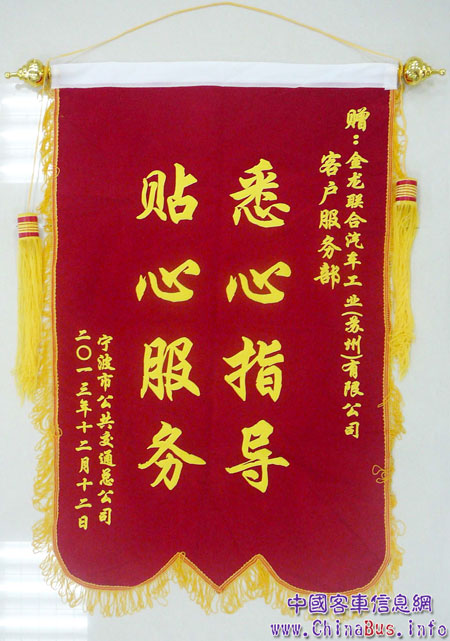 2013年12月14日,海格收到寧波公交公司的表揚信,信中對海格服務(wù)予以高度稱贊,并送來“悉心指導(dǎo)、貼心服務(wù)”的錦旗,以表達(dá)對蘇州金龍多年來在新車型、新技術(shù)以及提高維修人員技能水平方面的培訓(xùn)支持表示感謝。