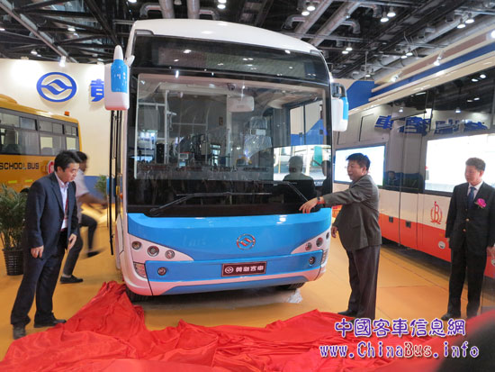 此次展出的黃海DD6821G01客車是黃海超級巴士系列的一員。該系列產(chǎn)品由黃?蛙嚭统V莨宦(lián)合開發(fā),因?yàn)檐嚿砩蠐碛锌勺兩实难鼛Ш驮煨酮?dú)特的水滴狀車頭,行業(yè)內(nèi)人送外號“超級萌物”或“小萌物”。