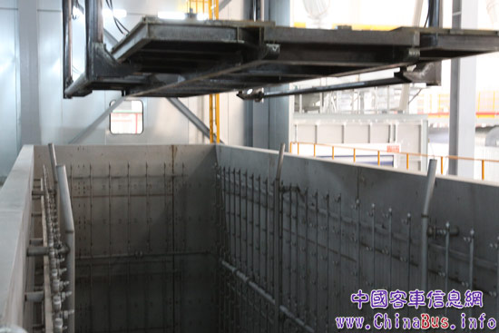 在電泳線生產(chǎn)車間內(nèi),記者了解到,中通客車整車電泳線區(qū)別于行業(yè)其它電泳線布局,所有工序連接并非一條直線,而是采用“U”型設(shè)計,此種分開設(shè)計方法可避免各個工序所產(chǎn)生的霧狀雜質(zhì)漂浮到電泳槽里面,可充分保證電泳槽的高度清潔和指標(biāo)穩(wěn)定。