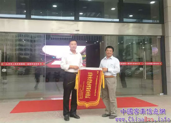 10月28日,大金龍綠色通勤保障團(tuán)隊(duì)收到青運(yùn)會(huì)組委會(huì)的一份特殊獎(jiǎng)勵(lì)。福建省體育局副巡視員、青運(yùn)會(huì)組委會(huì)資源開發(fā)部部長甘式光親手將印有“優(yōu)秀青運(yùn)綠色通勤服務(wù)團(tuán)隊(duì)”的錦旗遞交給大金龍售后服務(wù)部經(jīng)理王端峰。寥寥12字表達(dá)了青運(yùn)會(huì)期間組委會(huì)對(duì)大金龍新能源通勤服務(wù)的高度肯定,也凝聚著大金龍保障團(tuán)隊(duì)眾人的心血。