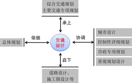 《導(dǎo)則》將交通設(shè)計(jì)這一工作內(nèi)容定位為“城市交通規(guī)劃設(shè)計(jì)與實(shí)施系統(tǒng)中必要環(huán)節(jié)和銜接手段”,如下圖所示,交通設(shè)計(jì)工作向上承接綜合交通規(guī)劃和各類(lèi)交通專(zhuān)項(xiàng)規(guī)劃(道路網(wǎng)、公共交通、軌道交通、步行和自行車(chē)等),向下指導(dǎo)具體的交通基礎(chǔ)設(shè)施的施工設(shè)計(jì)和實(shí)際建設(shè)。在城市規(guī)劃的技術(shù)體系內(nèi),交通設(shè)計(jì)是深化城市總體規(guī)劃戰(zhàn)略思路的有力工具,將相對(duì)抽象的規(guī)劃理念,通過(guò)具體化的控制要素進(jìn)行落實(shí),并在控制性詳細(xì)規(guī)劃和城市設(shè)計(jì)等環(huán)節(jié)中得以體現(xiàn)。