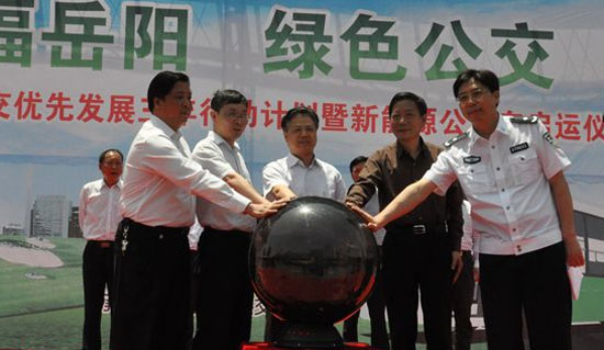 2015年5月12日,湖南省岳陽(yáng)市城區(qū)首批200臺(tái)插電式混合動(dòng)力新能源公交車投入使用,標(biāo)志著岳陽(yáng)市公交事業(yè)發(fā)展又邁上了一個(gè)新的臺(tái)階。湖南岳陽(yáng)市領(lǐng)導(dǎo)盛榮華、陳國(guó)榮、陳恢清、唐文發(fā)、歐江平,市政府秘書長(zhǎng)談?wù)t等出席推進(jìn)公交優(yōu)先發(fā)展“三年行動(dòng)計(jì)劃”暨新能源公交車啟運(yùn)儀式。