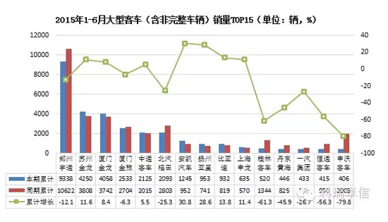 2015年6月國(guó)內(nèi)大型客車(chē)(含非完整車(chē)輛)產(chǎn)量7622輛,累計(jì)產(chǎn)量33558輛,同比增長(zhǎng)1.95%,累計(jì)下降4.84%;本月國(guó)內(nèi)大型客車(chē)(含非完整車(chē)輛)銷(xiāo)量7527輛,累計(jì)銷(xiāo)量31816輛,同比下降4.53%,累計(jì)下降12.70%。其中鄭州宇通累計(jì)銷(xiāo)量排名第一,累計(jì)銷(xiāo)售9338輛,累計(jì)下降12.1%;安凱汽車(chē)今年表現(xiàn)良好,2015年1-6月累計(jì)增長(zhǎng)30.8%;而申沃客車(chē)的大型客車(chē)銷(xiāo)量則比同期累計(jì)下降79.8%。
