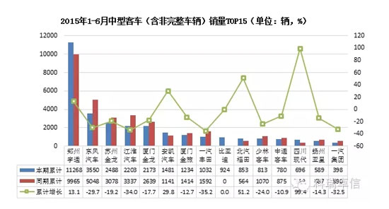 2015年6月國(guó)內(nèi)中型客車(chē)(含非完整車(chē)輛)產(chǎn)量6768輛,累計(jì)產(chǎn)量32511輛,同比下降3.56%,累計(jì)下降1.85%;本月國(guó)內(nèi)中型客車(chē)(含非完整車(chē)輛)銷(xiāo)量6736輛,累計(jì)銷(xiāo)量32583輛,同比下降9.78%,累計(jì)下降5.45%。其中鄭州宇通累計(jì)銷(xiāo)量排名第一,累計(jì)銷(xiāo)售11268輛,累計(jì)增長(zhǎng)13.1%;四川現(xiàn)代今年表現(xiàn)良好,2015年1-6月累計(jì)增長(zhǎng)接近100%;而一汽豐田的中型客車(chē)銷(xiāo)量則比同期累計(jì)下降35.2%。