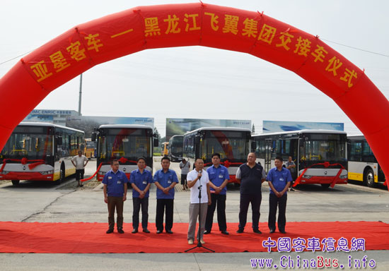 8月25日,亞星廣場(chǎng)上20輛JS6108油電混合動(dòng)力客車(chē)依次排開(kāi)整張待發(fā)。伴隨歡快的音樂(lè)聲,交車(chē)儀式正式開(kāi)始。亞星客車(chē)黨委書(shū)記王延磊,副總經(jīng)理馬佃亮、黑龍江飛翼集團(tuán)總經(jīng)理李曉剛等相關(guān)領(lǐng)導(dǎo)共同出席本次發(fā)車(chē)儀式。