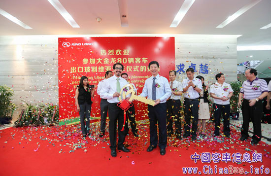 9月29日,“中玻友誼 源遠(yuǎn)流長(zhǎng)——大金龍80輛客車出口玻利維亞交車儀式”在廈門現(xiàn)代碼頭隆重舉行,玻利維亞首都拉巴斯議會(huì)議長(zhǎng)Fabian Siñani率領(lǐng)代表團(tuán)親臨廈門,在廈門各相關(guān)部門領(lǐng)導(dǎo)見(jiàn)證下,接過(guò)了金龍汽車集團(tuán)、大金龍董事長(zhǎng)廉小強(qiáng)手中的金鑰匙。廈門市副市長(zhǎng)李棟梁親切接見(jiàn)了玻利維亞客人,并代表廈門市政府對(duì)其致以熱烈的歡迎。