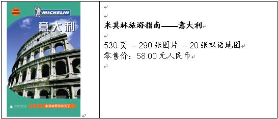 該書中,中國(guó)讀者所熟悉的羅馬競(jìng)技場(chǎng)、比薩斜塔、米蘭大教堂、龐貝古城等著名旅游勝地以及包括羅馬、佛羅倫薩、威尼斯等34個(gè)旅游城市都有詳細(xì)的介紹。在米其林旅游指南一貫嚴(yán)謹(jǐn)和客觀的基礎(chǔ)上,該旅游指南還特別照顧到國(guó)內(nèi)游客的閱讀習(xí)慣和旅行需要,專門添加了如景點(diǎn)背景故事、可選購(gòu)的紀(jì)念品等內(nèi)容,以求為游客提供最為詳盡的旅游信息內(nèi)容。全書突出描述了意大利璀璨和悠久的藝術(shù)文化,并依靠米其林公司長(zhǎng)期累積的資源,增添了許多實(shí)用的旅游資訊,包括雙語實(shí)用地圖、景點(diǎn)信息、交通路線等,方便和幫助游客合理安排好自己的行程,在有限的時(shí)間內(nèi)盡情領(lǐng)略意大利各個(gè)地區(qū)的獨(dú)特魅力和風(fēng)土人情,充分享受旅行的樂趣。該書四月份開始在全國(guó)各大新華書店上架。