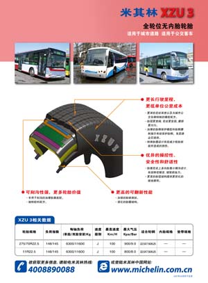 從90年代開始,米其林不斷研發(fā)并開始生產(chǎn)城市道路專用輪胎,以滿足城市車輛的使用要求。米其林集團(tuán)向北京公交提供的275/70R22.5XZU3輪胎是其全球最新研發(fā)的公交專用產(chǎn)品,同時(shí)也是其首先在中國(guó)生產(chǎn)的一款輪胎。這款輪胎花紋更深,使輪胎壽命最大化;胎冠接地面積更寬闊,磨損更均勻;新的花紋設(shè)計(jì)令花紋塊更堅(jiān)固,接地面磨損更均勻,從而保證輪胎有更長(zhǎng)的里程壽命,降低客戶的每公里單位成本;特別設(shè)計(jì)的輪胎趾口可避免安裝和拆卸時(shí)的損傷,降低客戶的維護(hù)保養(yǎng)成本;胎側(cè)加厚,帶來(lái)更好的胎側(cè)保護(hù),減少與路邊碰撞的損傷;胎面花紋上密集的小橫溝可使輪胎接地面積更大,濕地抓地力更好,更加安全可靠;在胎面花紋上運(yùn)用了先進(jìn)的多向性胎面小橫溝設(shè)計(jì),使輪胎噪音有效減少,帶給乘客更加安靜舒適的感受。