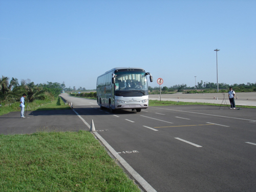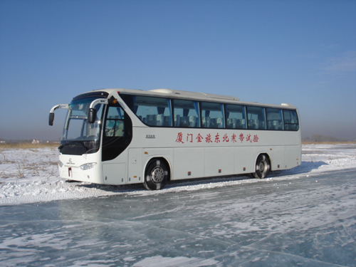 2007年2月份,在一年中最冷的時(shí)候,XML6127客車遠(yuǎn)赴齊齊哈爾,在零下20℃的方圓數(shù)十平方公里的冰雪場(chǎng)地上進(jìn)行了ABS、暖風(fēng)、除霜、除霧等一系列高寒試驗(yàn)。XML 6127車型配置的幾家ABS產(chǎn)品現(xiàn)場(chǎng)試驗(yàn)都表現(xiàn)出了良好的性能。整車方向性較好,不跑偏,制動(dòng)時(shí)震動(dòng)柔和;起步、加速時(shí)ASR工作良好,可平穩(wěn)起步、加速;在70km/h對(duì)開試驗(yàn)時(shí),沒(méi)有跑偏、甩尾現(xiàn)象,輪胎沒(méi)有明顯拖痕;車速5km/h時(shí)ABS仍然工作。除霜、除霧試驗(yàn)中除霜、除霧的時(shí)間遠(yuǎn)小于國(guó)家標(biāo)準(zhǔn)的要求。