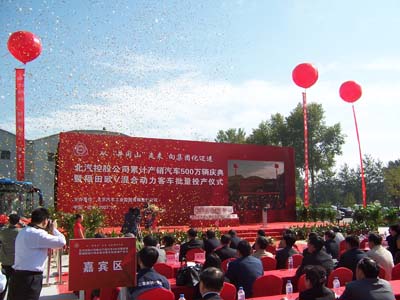 10月12日,“北汽控股公司累計產(chǎn)銷500萬輛汽車慶典暨福田歐V混合動力客車批量投產(chǎn)儀式”在福田汽車工程研究院節(jié)能減排重點試驗室南門廣場隆重舉行。它不僅標(biāo)志著北京汽車工業(yè)系統(tǒng)累計生產(chǎn)汽車已經(jīng)突破500萬輛,同時也標(biāo)志著福田汽車響應(yīng)建設(shè)節(jié)約型社會號召的典型產(chǎn)品――歐V混合動力客車正式批量投產(chǎn)。這個日子注定要被載入北汽集團的史冊,也必將會被中國汽車工業(yè)的發(fā)展歷史所牢記。本次活動在黨的十七大召開前夕舉行,不僅展示了北京工業(yè)發(fā)展的成就,同時也是向黨的十七大最好的獻禮。