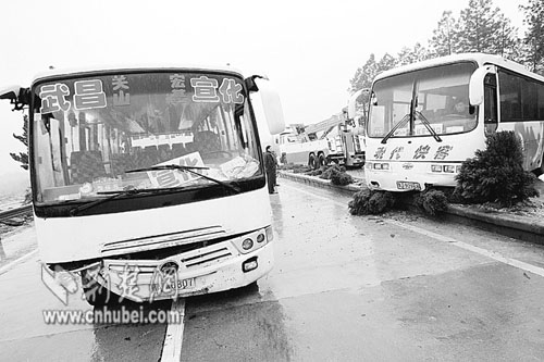事發(fā)不久,記者趕到了現(xiàn)場(chǎng),車禍發(fā)生在岱黃高速距武漢外環(huán)出口1000米處??蛙囁緳C(jī)黃師傅介紹,上午10時(shí)10分,他開著“武昌-宣化”的客車經(jīng)過該處時(shí),左前輪突然爆胎,客車撞上公路右側(cè)的護(hù)欄后橫在路上。車停下來后,他連忙讓車內(nèi)的10多名乘客下車。因下雨路滑,車速較慢,沒有人員受傷。隨后,一輛跟在后面的“漢口-紅安”的客車為避讓,越過路中的隔離綠化帶,沖進(jìn)對(duì)面車道,橫在路上,幸好當(dāng)時(shí)沒有其他車輛經(jīng)過。