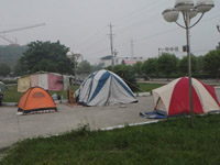 在工作人員的幫助下,我們得到了停車的位置,并找到了我們搭帳篷的空地。周圍的“鄰居”都過來幫我們,還給我們送來他們的小板凳、小桌椅等招呼我們坐,大家相互問長問短,沒有一點陌生感。鄰居告訴我們,他們是12號那天下午搬來的,家里的房子震裂了,需要災(zāi)后加固才能使用,家人都很幸運(yùn)沒有傷亡?,F(xiàn)在他們的基本生活沒什么問題,物價也沒漲,才上市的桃子才1元錢斤,讓我們一定在附近買點來嘗鮮。附近的超市基本生活物資也有供應(yīng),就是帳篷很緊張,篷布市面上買不到,只能用塑料薄膜“蓋房子”,政府得到的捐贈帳篷都要送到受災(zāi)更嚴(yán)重的災(zāi)民手里去,他們前幾天也都主動到重災(zāi)區(qū)去支援和捐款了,“我們畢竟幸運(yùn)得多!四川人都是一家人,我們應(yīng)該去幫助我們的家里人!”