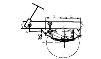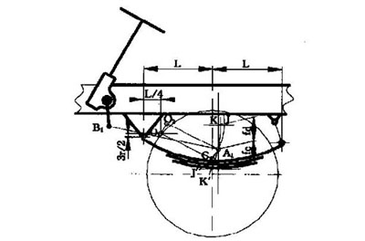 在此結(jié)構(gòu)中, 一方面轉(zhuǎn)向輪依靠板簧導(dǎo)向來保證車輪與車身的相對運動, 另一方面轉(zhuǎn)向器與轉(zhuǎn)向輪之間的傳動機件也使車輪與車身之間有一定的相對運動關(guān)系。這兩種運動關(guān)系是靠兩套獨立的機構(gòu)來實現(xiàn)的。況且客車的前懸一般都較長, 很難使其垂臂球銷B1 點在圖3 中的O1 點附近。當(dāng)前輪上下跳動時, 轉(zhuǎn)向節(jié)臂球銷中心A1 要沿著彈簧主片中心所決定的軌跡運動。其運動軌跡為圓孤JJ ′。另一方面A1 點是縱拉桿上的一點, 縱拉桿是繞轉(zhuǎn)向垂臂下端球銷中心B1 點擺動。其擺動軌跡為圓孤KK′。從簡圖可看出這兩種運動不協(xié)調(diào)。這種偏差在輪胎經(jīng)常跳動范圍內(nèi)應(yīng)保持在輪胎的彈性范圍內(nèi)。如果偏差過大, 則應(yīng)修改B1 點的位置(A 1 點的位置由前橋生產(chǎn)廠設(shè)計).