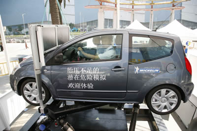 和傳統(tǒng)的安全活動不同,米其林通過本次巡展活動的明星——業(yè)內(nèi)獨一無二的 “米其林輪胎駕駛安全模擬器”,用高科技的手段模擬和再現(xiàn)了真實的駕駛環(huán)境,讓駕駛者在高科技的虛擬現(xiàn)實中了解輪胎安全、特別是合理的胎壓對安全駕駛的重要意義。“米其林輪胎駕駛安全模擬器”由一臺駕駛模擬器和一輛轎車組成,通過虛擬現(xiàn)實技術(shù),米其林在模擬器的系統(tǒng)中植入了輪胎反應(yīng)模型,使輪胎的各項性能指標(biāo)都精確模擬了真實的駕駛行為,因此可以讓駕車人在高度安全的狀態(tài)下真實體驗到不正確胎壓問題可導(dǎo)致的事故或風(fēng)險。而平時,駕車人絕不可能在一輛真實汽車上體驗這些狀況,因為那將置駕乘者于危險境地。