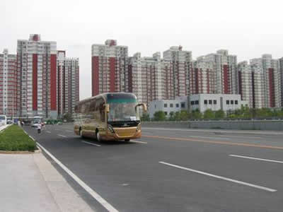金旅XML6125開(kāi)拓者豪華客車(chē)行駛在奧林匹克射箭場(chǎng)附近