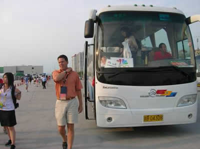 承擔(dān)中國(guó)傳媒大學(xué)到首都體育館間的奧運(yùn)志愿者接送工作的金旅客車(chē)